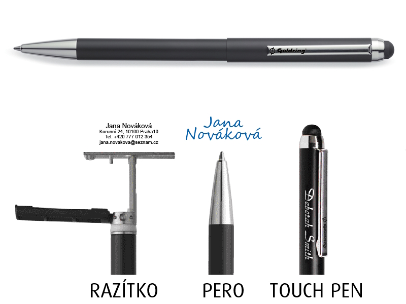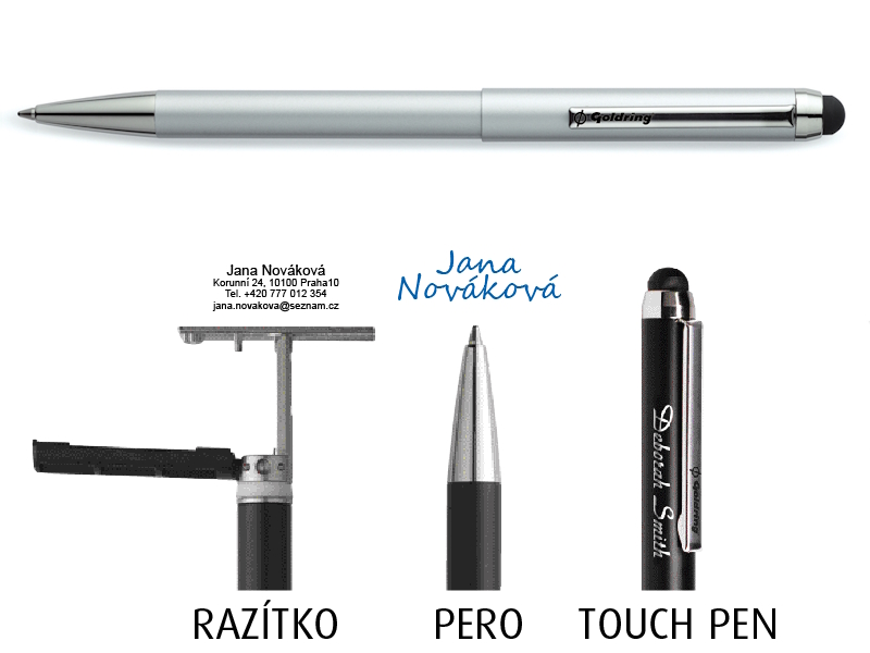 Propisovací tužka Goldring Style s vestavěným razítkem pro max. 3 řádky textu a hrotem pro práci s dotykovými displeji.